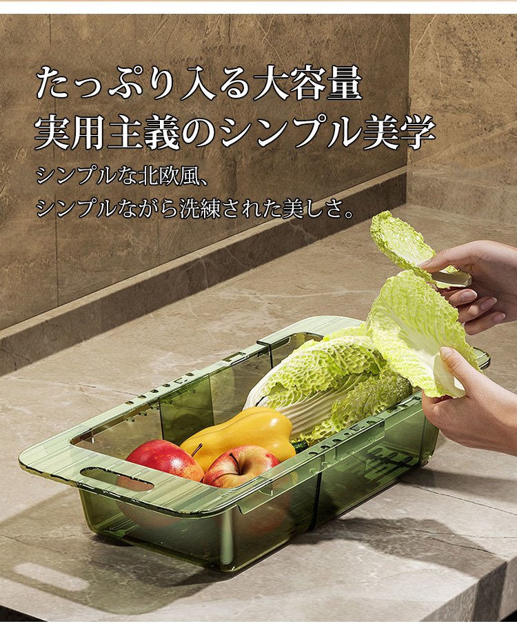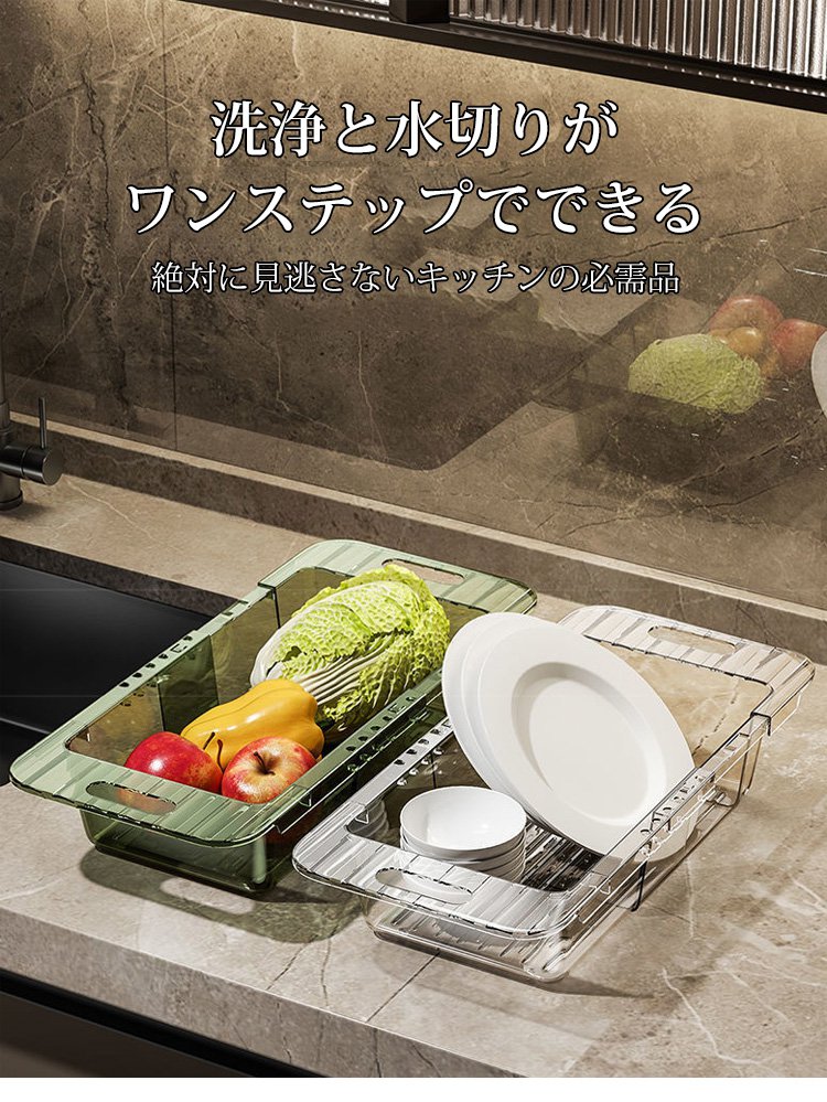 伸縮機能でサイズ調整中の水切りかご